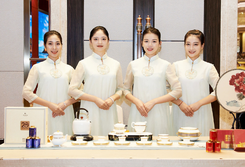 華祥苑茶藝師提供茶敘服務(wù)并獻(xiàn)上一杯扶貧白茶。